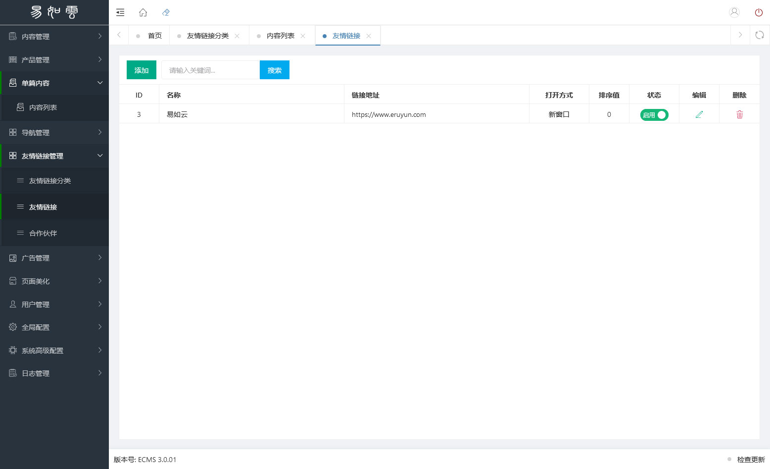 为了更方便的管理导航,EruCms的友情链接是独立管理的,包括但不限于: 友情链接,合作伙伴等,可以非常方便的扩展成各类展示应用,十分便捷。